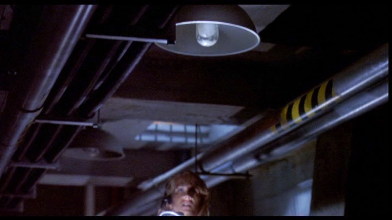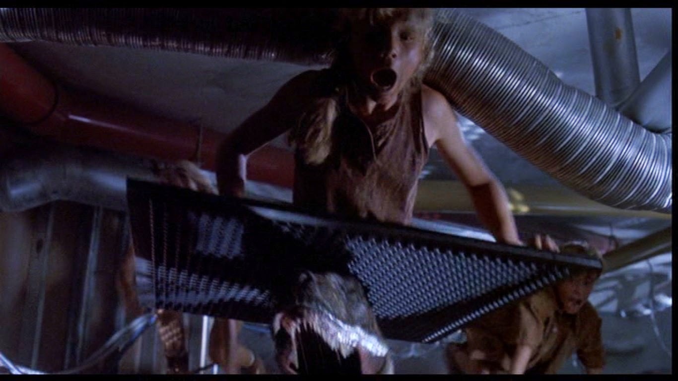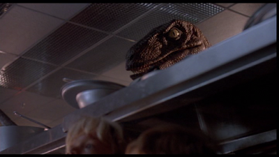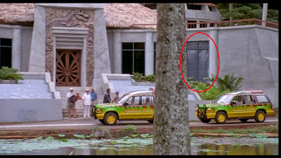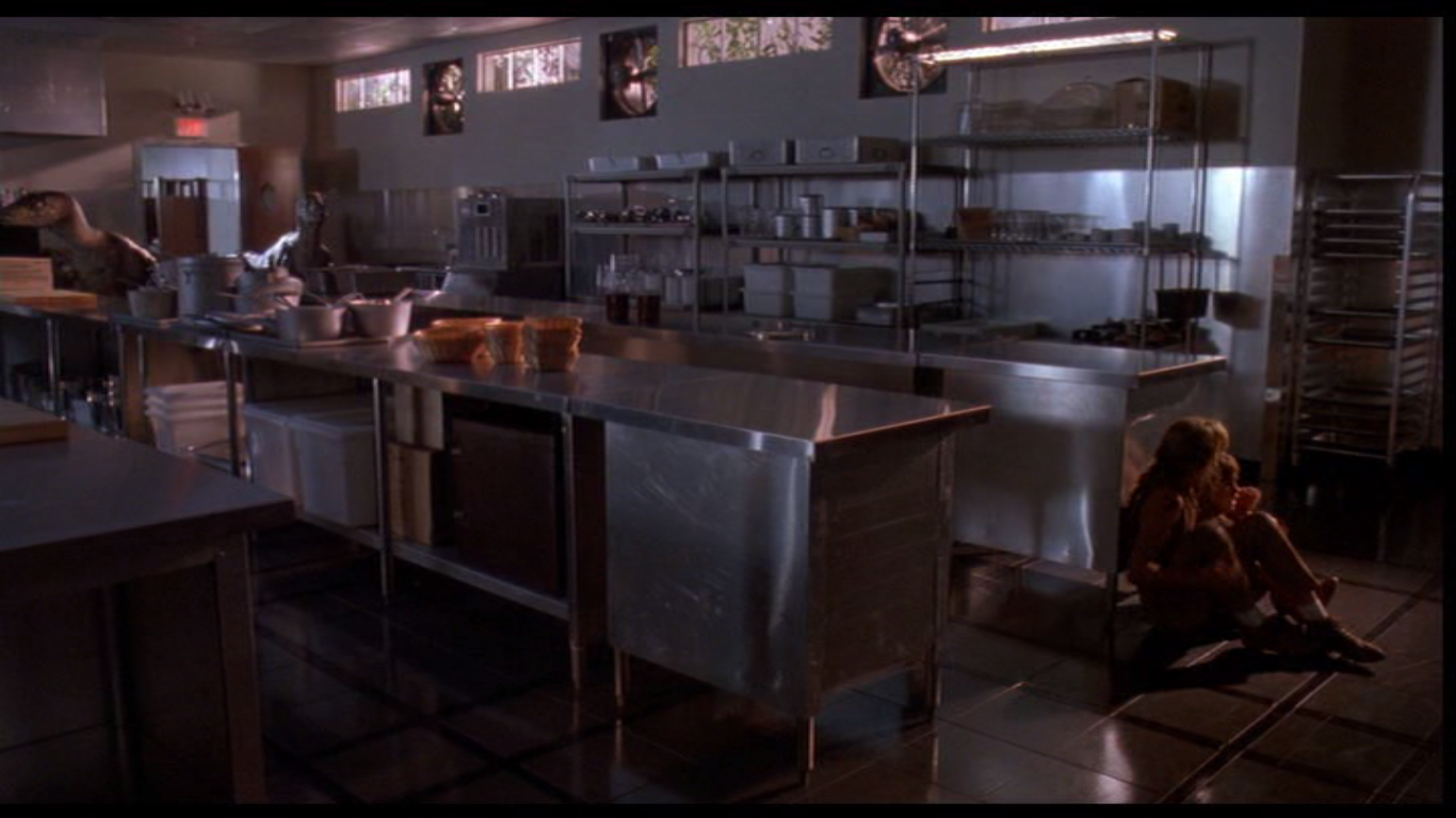 Una de las escenas más famosas de Parque Jurásico es la intrusión de los Velociraptores en la cocina. En ésta, podemos ver unos ventiladores para la extracción de humos. A su vez, vemos unos ladrillos o bloques de vidrio, también conocido como "pavés", para dotar de iluminación natural a la cocina. La salida de emergencia está bien señalizada sobre la puerta.