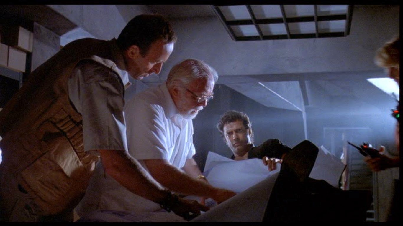 Para ello John Hammond recurre a unos planos de instalaciones para guiar por walkie talkie a la doctora Sattler por el edificio de mantenimiento. Muldoon, el experto de Velociraptores también muestra interés por la profesión de Aparejador. Al fondo vemos a Ian Malcom que no está muy convencido de la interpretación de planos de John.