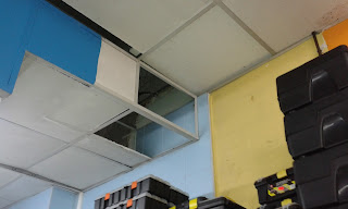 En la siguiente fotografía, un error constructivo relacionado con una rejilla en este falso techo de perfilería negra. A simple vista no observamos nada, pero si nos acercamos, nos cercioramos del "recurso" utilizado...