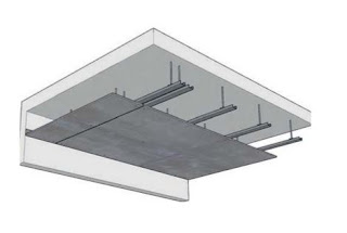 Techos. Al igual que un falso techo convencional, estos paneles se fijan mediante tornillos o remaches a unos perfiles metálicos anclados al techo mediante varilla roscada.