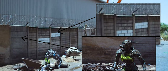 Ya hacia el final de la película, tanto Chappie como su creador (Dean) transfieren sus conciencias a otros robots. Cuando se reencuentran, Chappie aparece en el cuerpo de un robot cercano a la construcción de un muro. Además de las dos carretillas, podemos ver como la ejecución del muro es bastante irregular: