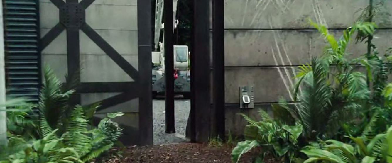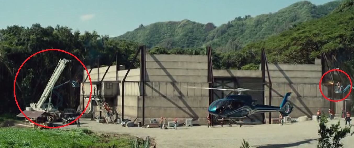 En la siguiente fotografía vemos el recinto del Indominus Rex, el nuevo dinosaurio modificado genéticamente. Este complejo está formado por muros de hormigón prefabricado y perfiles metálicos. Se pueden distinguir varios obreros trabajando en las inmediaciones. Todos ellos parecen estar provistos de los EPI's necesarios (casco, chaleco, botas...). A la derecha del todo podemos ver un soldador subido en una plataforma o grúa elevadora ejecutando una unión metálica. A la izquierda encontramos una grúa telescópica todoterreno.
