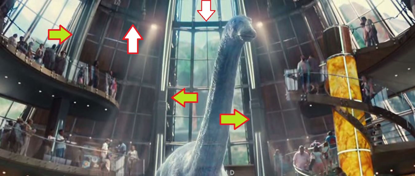 Llama la atención como en cada uno de los edificios y recintos que hemos analizado encontramos diversas figuras y formas geoétricas: un cono en el centro de visitantes, un octógono en el recinto de los raptores, un cilindro en el recinto del rex, y una semiesfera como veremos después en el aviario.