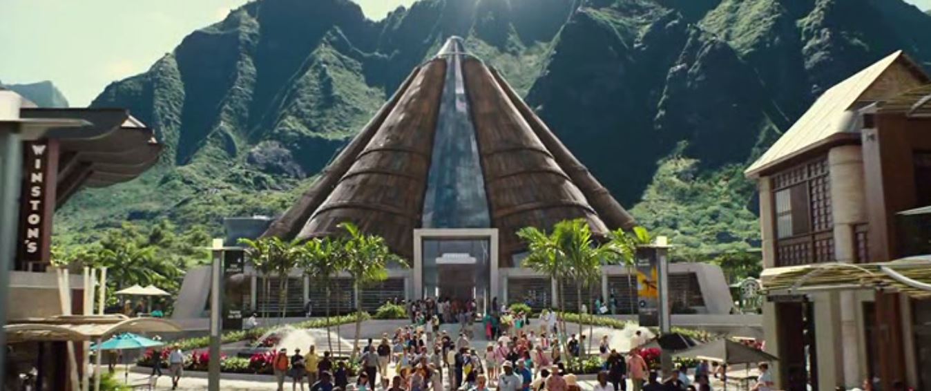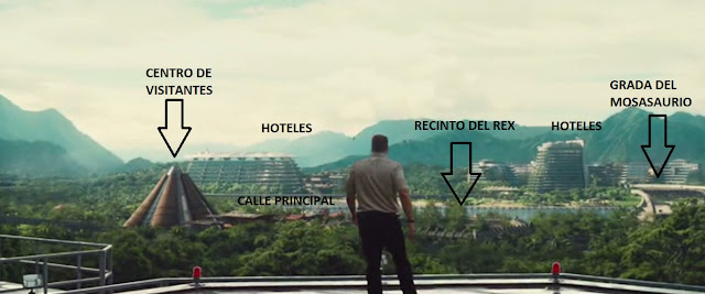 En el siguiente plano, uno de los primeros de la película, observamos el complejo del parque casi en su totalidad. Mientras en la primera película se mostraba un parque en periodo de pruebas, en esta visualizamos un parque abarrotado, en pleno funcionamiento. Encontramos una gran variedad de construcciones entre las que se encuentran el centro de visitantes (el edificio más céntrico de la imagen), recintos para los dinosaurios, hoteles, restaurantes y todo tipo de atracciones. A continuación pasamos a describir algunos de ellos.