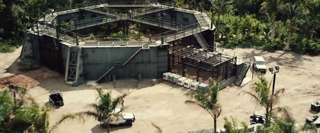 En la siguiente imagen se nos muestra una vista aérea del recinto de los velociraptores, lo que nos ayudará a conocer mejor la estructura. Está conformado por muros de hormigón dispuesto de tal forma que obtenemos una planta octogonal. Sobre estos muros se desarrollan unas plataformas metálicas perpendiculares entre sí y que cruzan el recinto pasando por el punto medio del octógono. Sobre los propios muros también se desarrollan pasarelas con sus respectivas barandillas. Anexo al recinto observamos un área de acceso que dispone de dos puertas de seguridad.
