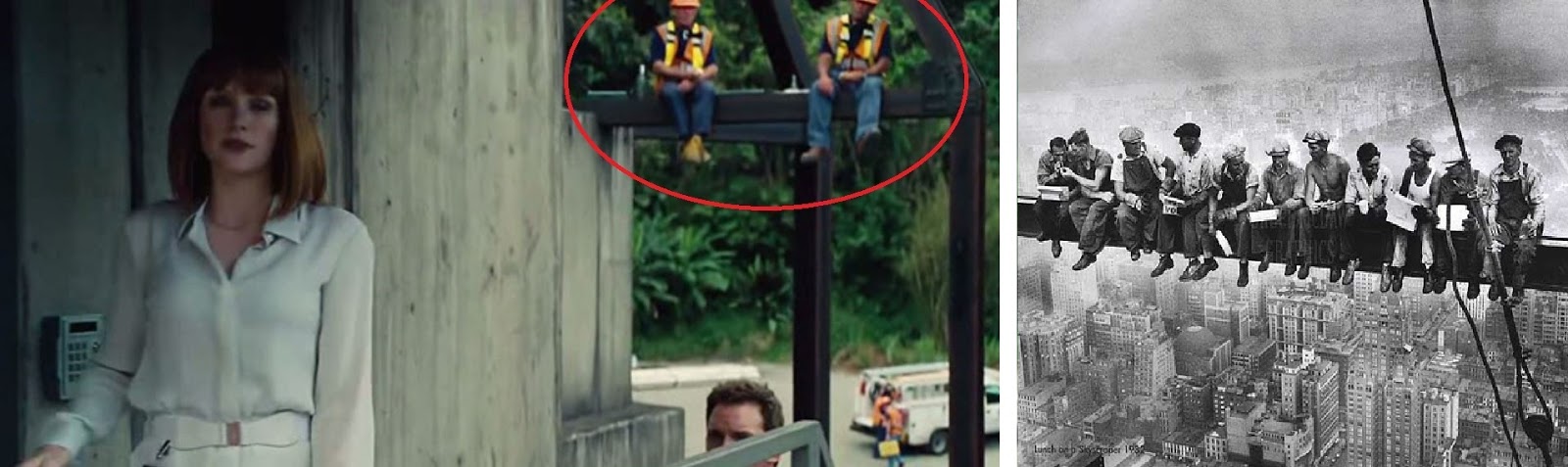 A continuación una de mis escenas favoritas. Sobre una de las vigas metálicas podemos ver dos obreros almorzando. Parecen disponer de un arnés de color amarillo. No obstante, supone un riesgo para la seguridad. ¿No os recuerda a la famosa fotografía de los obreros en la construcción del Empire State?