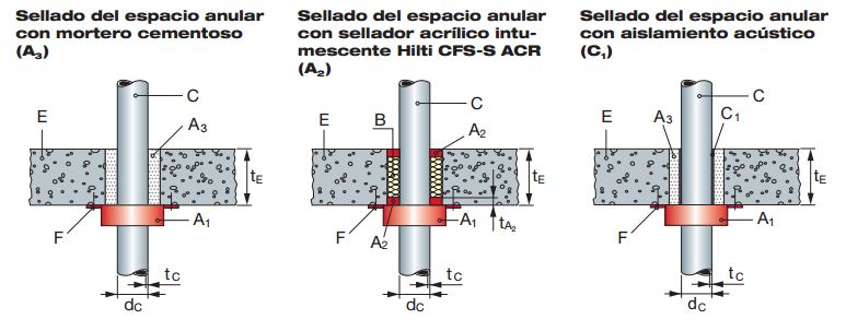 Es decir, la resistencia al fuego requerida a los elementos de compartimentación de incendios se debe mantener en los puntos en los que dichos elementos son atravesados por elementos de las instalaciones, como es el caso de nuestra bajante de PVC. El Código Técnico, en esta sección SI-1 del DB-SI, expone que puede optarse por las siguientes soluciones: